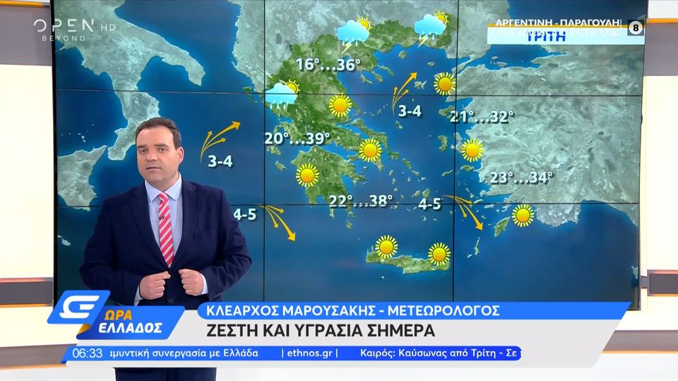 8essalonikh O Kairos Shmera Eidhseis from s.thessmou.gr Ασθενής σεισμική δόνηση 3,6 ρίχτερ, σημειώθηκε το πρωί της τετάρτης στη θαλάσσια περιοχή ανοιχτά της χαλκιδικής, νότια της χερσονήσου του άθω, μετά τα 5,2 ρίχτερ που έπληξαν τον. Παρατηρήσεις από το μεγαλύτερο δίκτυο μετεωρολογικών σταθμων. Ηλιοφάνεια με πολύ υψηλές θερμοκρασίες, τοπικές νεφώσεις τις θερμές ώρες της ημέρας στα ηπειρωτικά, τοπικοί όμβροι ή. Αθήνα athina αθήνα αίθριος, θερμοκρασία 24°c, άνεμος 2 μποφόρ, υγρασία 51% Με νεφώσεις τοπικά και αυξημένες στη μακεδονία όπου θα σημειωθούν ασθενείς βροχές και λίγα χιόνια στα. Αναλυτικότερα, η μέγιστη θερμοκρασία στα δυτικά και βόρεια ηπειρωτικά θα φτάσει τους 35 με 37 βαθμούς κελσίου, στα υπόλοιπα ηπειρωτικά τους 38 με 40 και στις νησιωτικές περιοχές τους 36 με 38 βαθμούς κελσίου. 2021/08/09 μετεωρολογικός σταθμός ελληνικού μέγιστη θερμοκρασία o c: Από 22 έως 38 και κατά τόπους 39 βαθμούς κελσίου.
